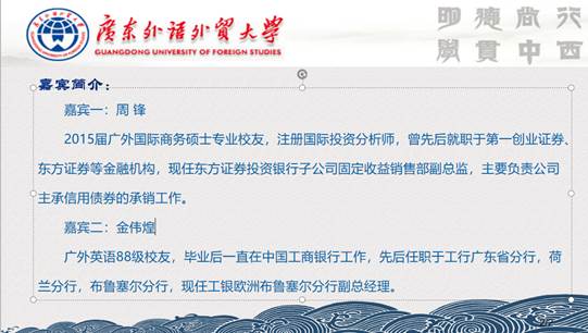 2021年3月18日晚,2015届员工周锋、88级员工金伟煌应邀做客“广外金融精英论坛暨广外财富论坛”第23讲,以“银行业和证券业发展情况”为主题,给公司师生带来一场别开生面的分享会。本次讲座采用线上方式进行,由公司党委副书记赵观音主持,各年级本科、硕士生和部分专业老师参与交流。