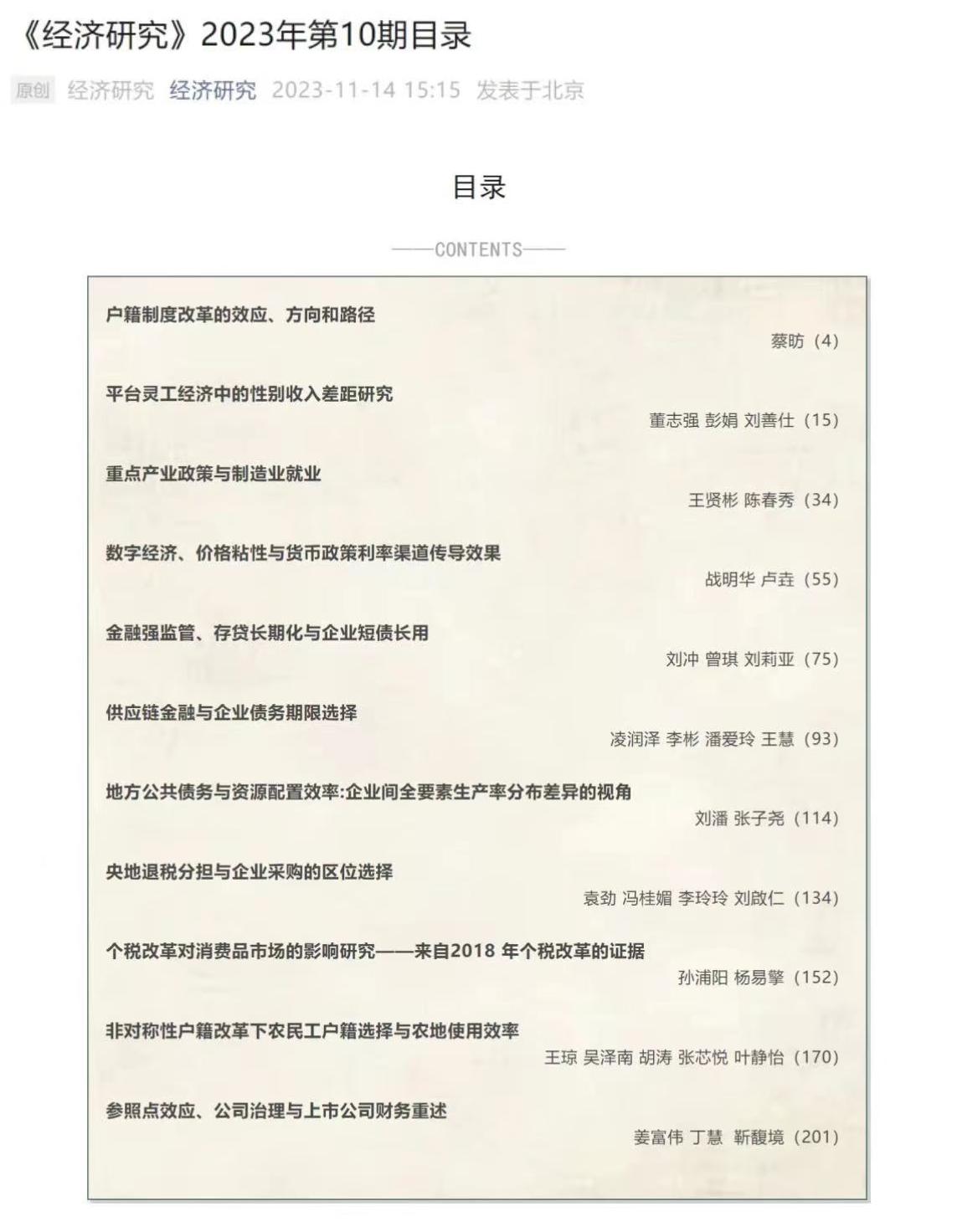 近日,公司以战明华教授为第一作者,博士生卢垚为通讯作者的合作论文“数字经济、价格粘性与货币政策利率渠道传导效果”在顶级期刊《经济研究》2023年第十期正式发表。