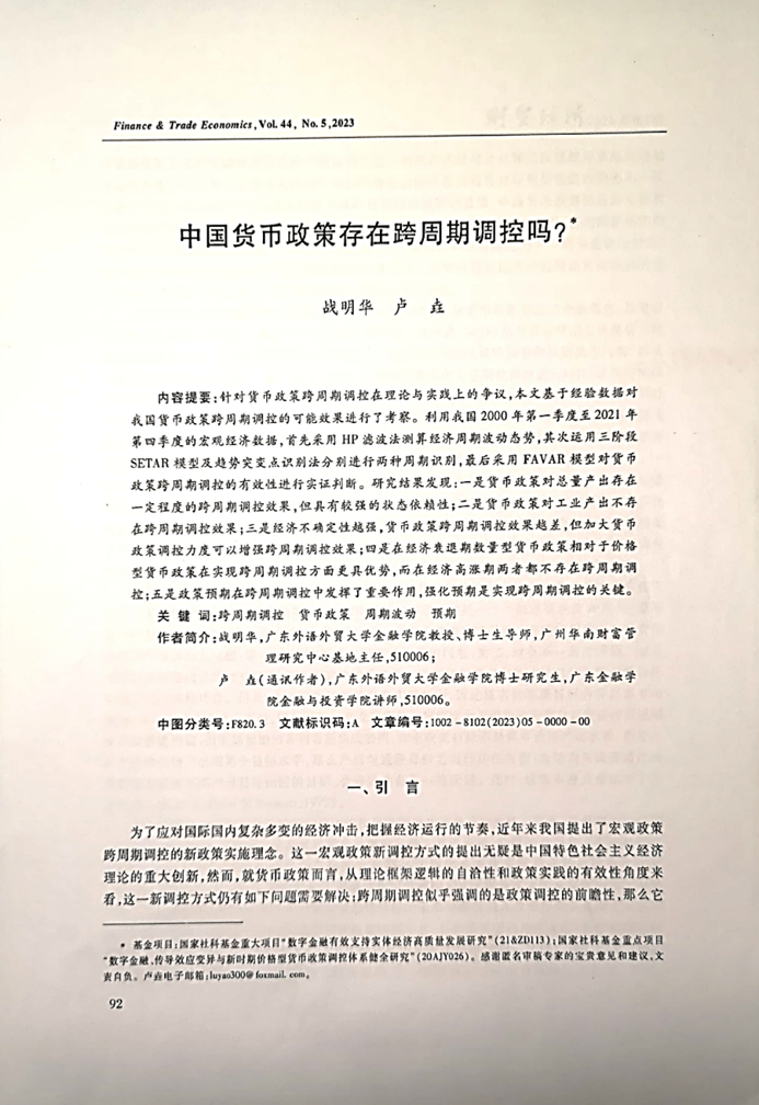 论文摘要:针对货币政策跨周期调控在理论与实践上的争议,论文基于经验数据对我国货币政策跨周期调控的可能效果进行了考察。我们利用我国2000年一季度至2021年四季度的宏观经济数据,首先采用HP滤波法测算经济周期波动态势,并接着运用三阶段SETAR模型及趋势突变点识别法分别进行两种周期识别,最后采用FAVAR模型对货币政策的跨周期调控有效性进行实证判断。研究结果发现:一是货币政策对于总量产出存在一定程度的跨周期调控效果,但具有较强的状态依赖性;二是货币政策对于工业产出不存在跨周期调控效果;三是经济不确定性越强,货币政策跨周期调控效果越弱,但提高货币政策调控力度可以增强跨周期调控效果;四是数量型货币政策相对于价格型货币政策在经济衰退期实现跨周期调控更有优势,而在经济高涨期两者都不存在跨周期调控;五是政策预期在跨周期调控中发挥重要作用,强化预期是实现跨周期调控的关键。