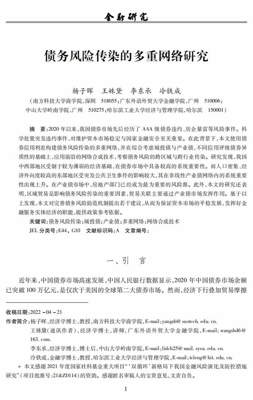 3、 王姝黛(通讯作者),《债务风险传染的多重网络研究》,《金融研究》2023年第3期