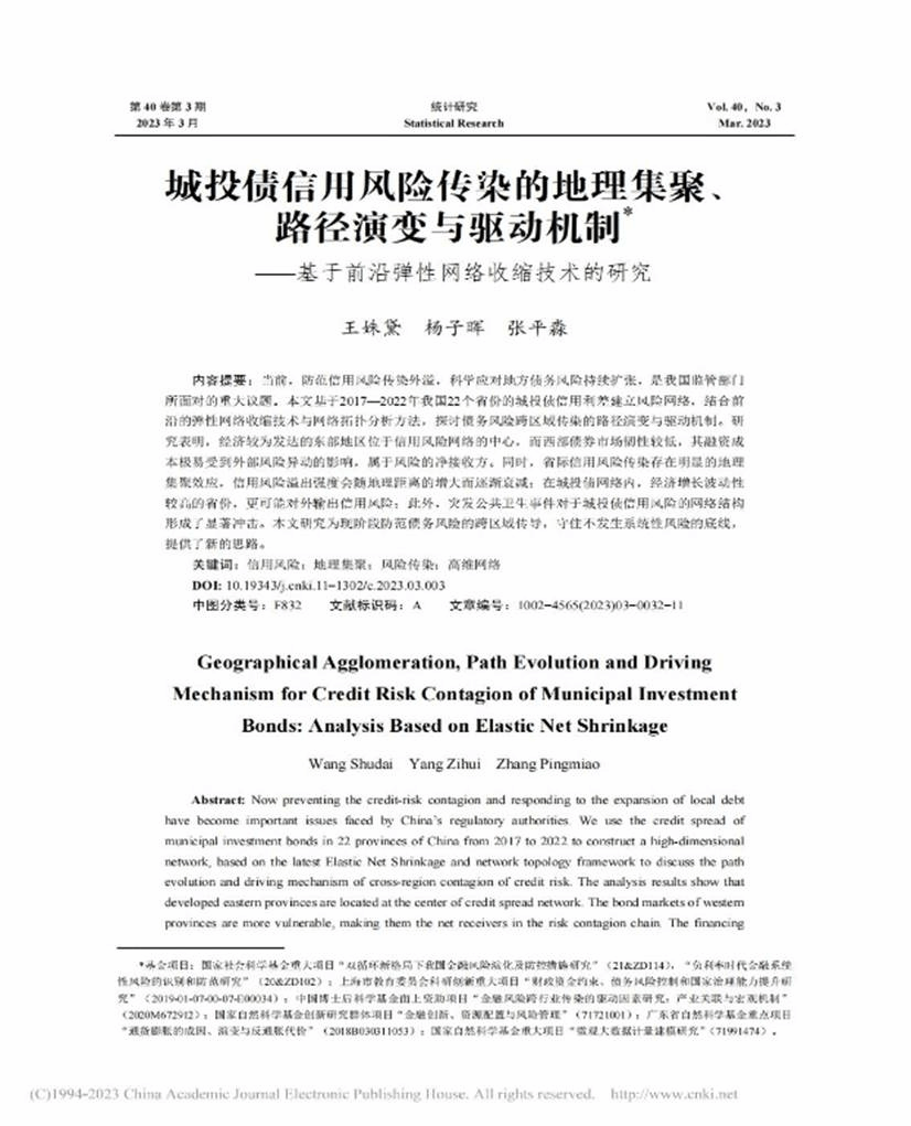 2、 王姝黛(第一作者),《城投债信用风险传染的地理集聚、路径演变与驱动机制——基于前沿弹性网络收缩技术的研究》,《统计研究》2023年第3期。