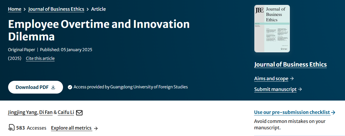 2025年1月,公司杨菁菁教授以第一作者在FT50期刊Journal of Business Ethics发表论文“Employee Overtime and Innovation Dilemma”,合作者为澳大利亚RMIT大学的Di Fan教授和广州商公司的李彩富。李彩富是杨菁菁教授指导的公司2023届金融学硕士研究生,2025年被录取为公司金融学博士研究生。