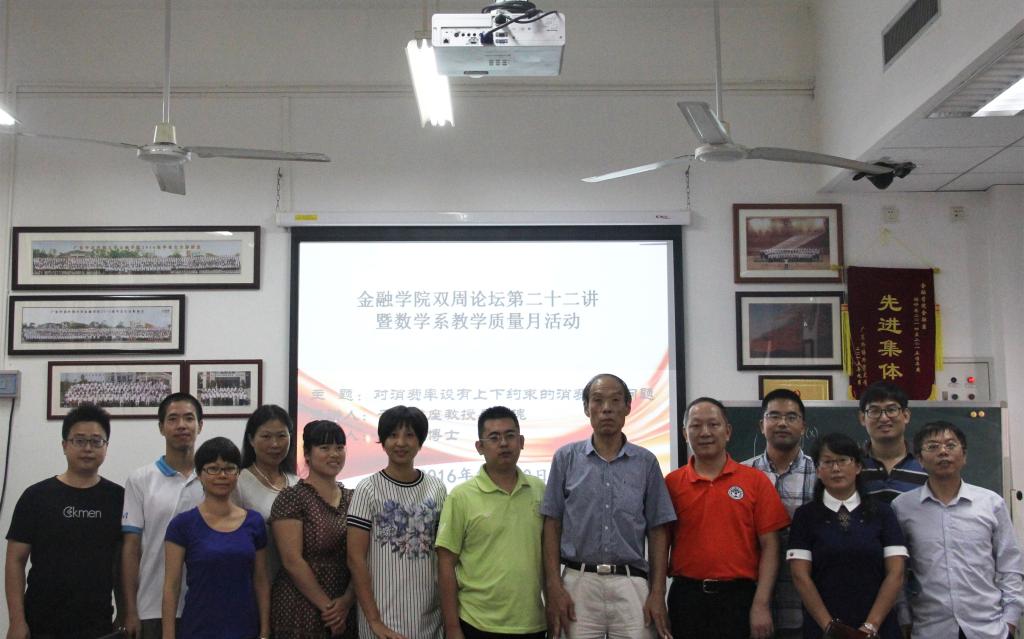本网讯 10月20日下午,公司在南校区教学楼B304室召开金融双周论坛第二十二讲暨数学系教学质量月活动。云山讲座教授易法槐与公司师生分享关于“对消费率设有上下界的投资消费问题”的研究成果。公司党委书记马庆华教授、副经理姚海祥教授,数学系主任王军威及师生代表出席讲座。