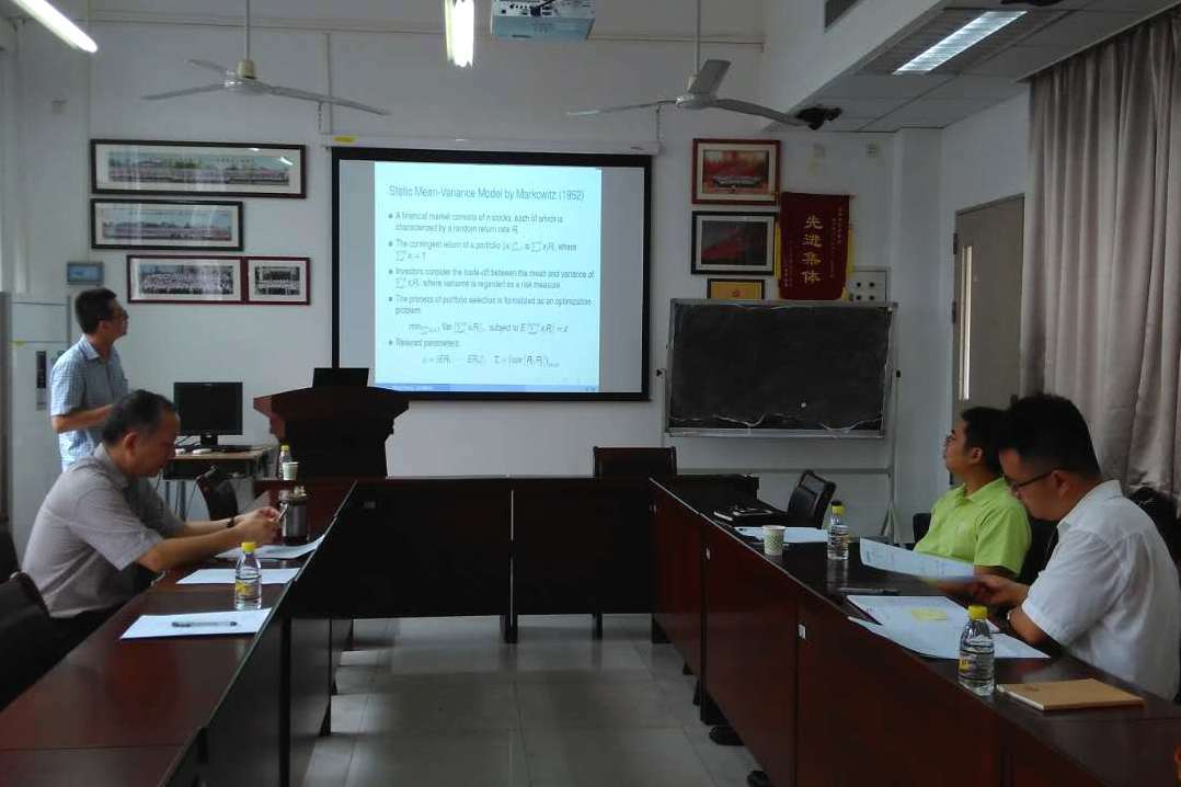 张淼博士分享了“Continuoustime mean-variance models of multiple assets in a stochastic environment”的研究成果,主要探讨了带有随机参数的连续时间均值方差模型在投资组合和资产负债管理中的应用。该报告考虑有一种无风险资产和多种风险资产的金融市场。首先,作者在一般框架下,运用鞅方法推导出了投资者的有效前沿和最优投资组合策略。因为涉及到倒向随机微分方程,无法得到一般情况下的显示解,只能在某些条件下,证明解的存在性和唯一性。当随机参数满足一个齐次的随机微分方程时,作者给出了随机倒向微分方程的一个数值解。其次,资产负债管理模型用CEV过程来模拟风险资产的价格,用几何布朗运动来模拟负债过程。通过运用线性二次随机控制中的配平方技术,作者用两个倒向随机微分方程的解来表示投资者的有效前沿。另外,在一些特殊情形下得到了倒向随机微分方程的显示解。