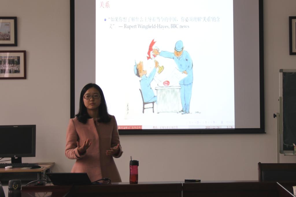 孙永苑博士则分享了“关系、正规与非正规信贷”。她指出其论文的研究目的,并通过引用中国家庭金融中心(CHFS)2011年的数据,运用回归模型得出关系在市场化进程中的替代、互补等作用。在内生性检验中,工具变量是除自家以外的社区(村)关系指数均值;内生性问题是基于Rivers和Vuong (1988)的内生性检验,该检验在10%的显著性水平下无法拒绝关系指数外生的原假设;弱工具变量问题是在1%的显著性水平下,Kleibergen-Paaprk的Wald F统计量大于临界值16.38(Stock和Yogo,2005),拒绝原假设,所以排除了弱工具变量的问题。最后得出结论:关系在正规信贷市场起着重要作用,而对于非正规信贷市场而言,除了亲缘类关系,其它关系子指数作用并不显著;尽管关系促进家庭获取金融资源,但是仅有亲缘类关系能够显著地缓解家庭的信贷约束;关系与收入正相关(Du et al.,2013),而拥有关系的家庭更可能获得银行贷款,并且获得银行贷款的数目和额度都相对较高;在市场转型时期,市场化也并未撼动其对家庭获取信贷资源的影响,关系以另外一种方式存在并起着其特有的作用。