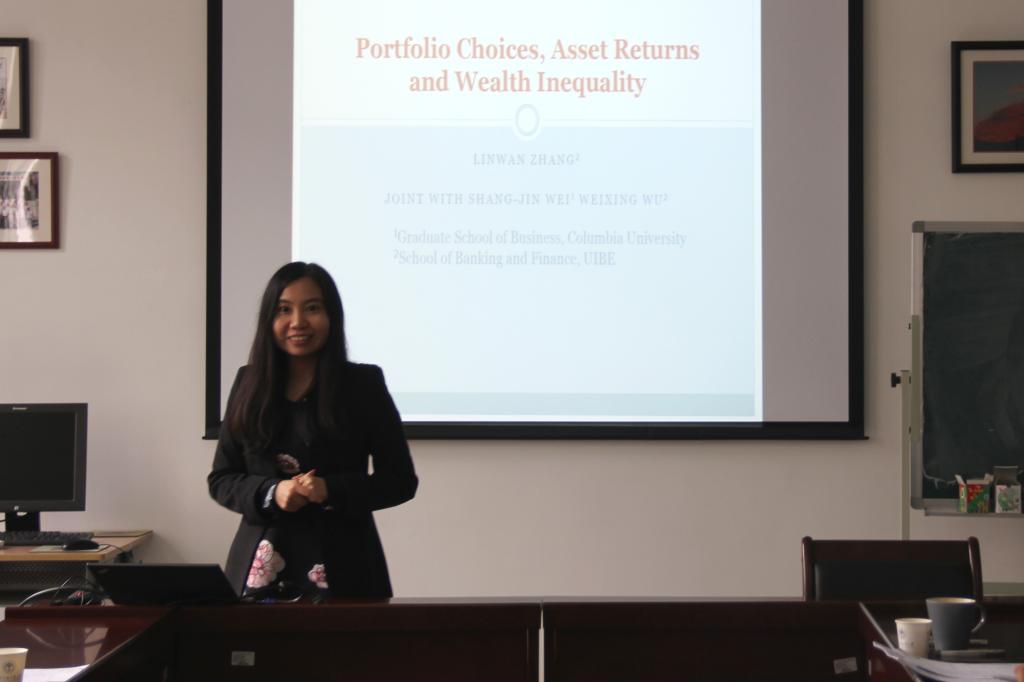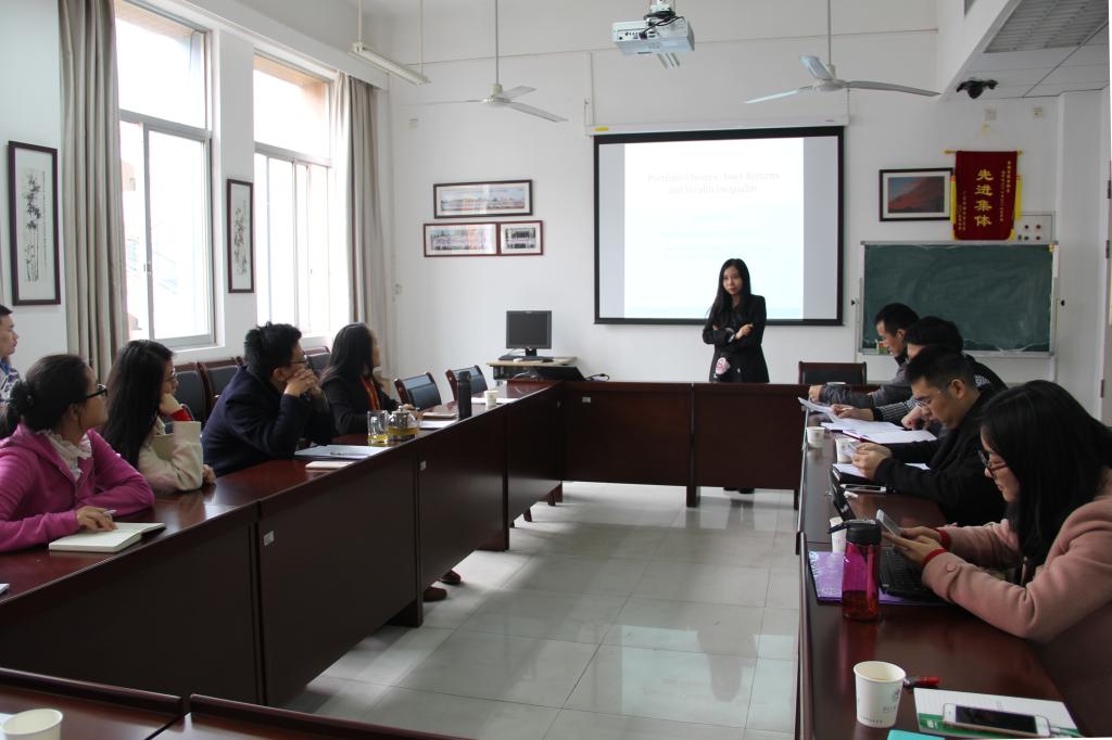 张琳琬博士主讲的内容为“家庭投资组合,资产收益与财富不平等”。她强调财富分布不平等的原因在于居民的相对风险厌恶程度随着财富的增加而递减,家庭资产组合投资行为的特点和效果将会受到财富的影响,这种现象结合较高的资本收益率是造成家庭财富不平等程度的加深。她指出,对于居民的资本市场参与行为与家庭分布的内容,并通过三种假说阐述其论文的研究目标。她通过家庭金融微观数据调查数据、资本市场历史收益数据等实证工具,运用投资组合、风险态度与财富的理论模型,得出资产收益与财富不平等的相关结论:财富越高的家庭资产组合的风险越高。家庭为了对冲这些风险,需要增加储蓄,这一机制可能导致财富分布更大的差距。