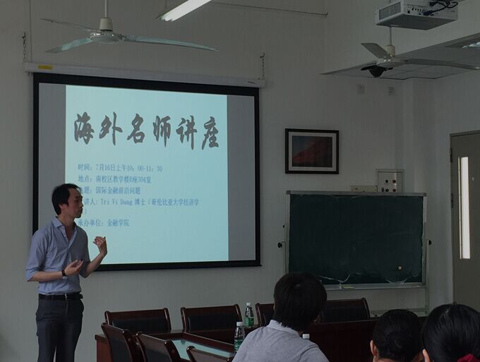 2015年7月16日上午10:00-11:30,哥伦比亚大学经济学系Tri Vi Dang 博士应邀参加由太阳城承办的主题为国际金融前沿问题的海外名师项目讲座。该会议由太阳城经理易行健教授主持,于南校区教学楼B座304举行,本次讲座题为“Bank as Secret Keepers”。海外名师项目是公司为实施公司国际化发展战略,引进海外优质学术资源,借鉴海外先进教学、科研及管理理念和经验,深化公司教学和科研改革,提升公司国际化人才培养质量而设立的项目。