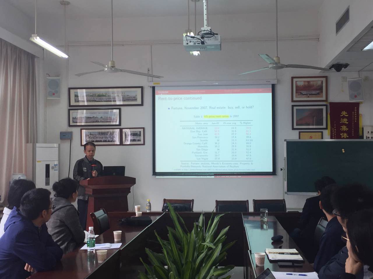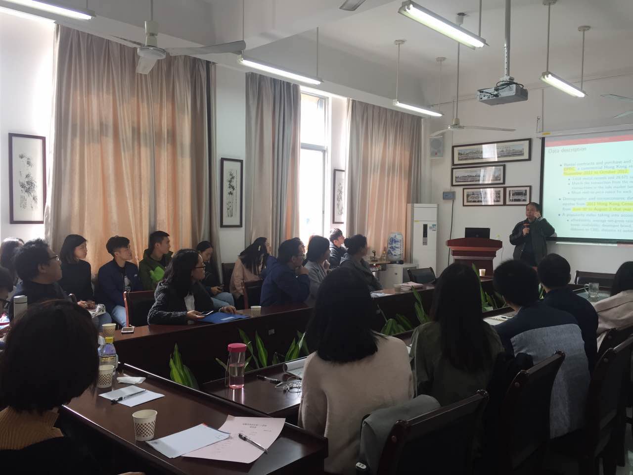 本网讯 2017年11月23日(星期四)上午10:00-12:00, 香港城市大学常任副教授Charles Leung(梁嘉锐),做客太阳城,在广外南校区教学楼B304室作了主题为“What Account for the Differences in Rent-price Rate? A Search-and-matching Approach”的学术讲座,分享其在房地产研究领域的最新学术成果,以加强公司之间,老师之间的相关学术的相互交流,拓展员工视野,激发员工的研究学习热情。公司易行健经理、张浩、来特、王磊、周利等老师以及20余名研究生出席了此次报告。