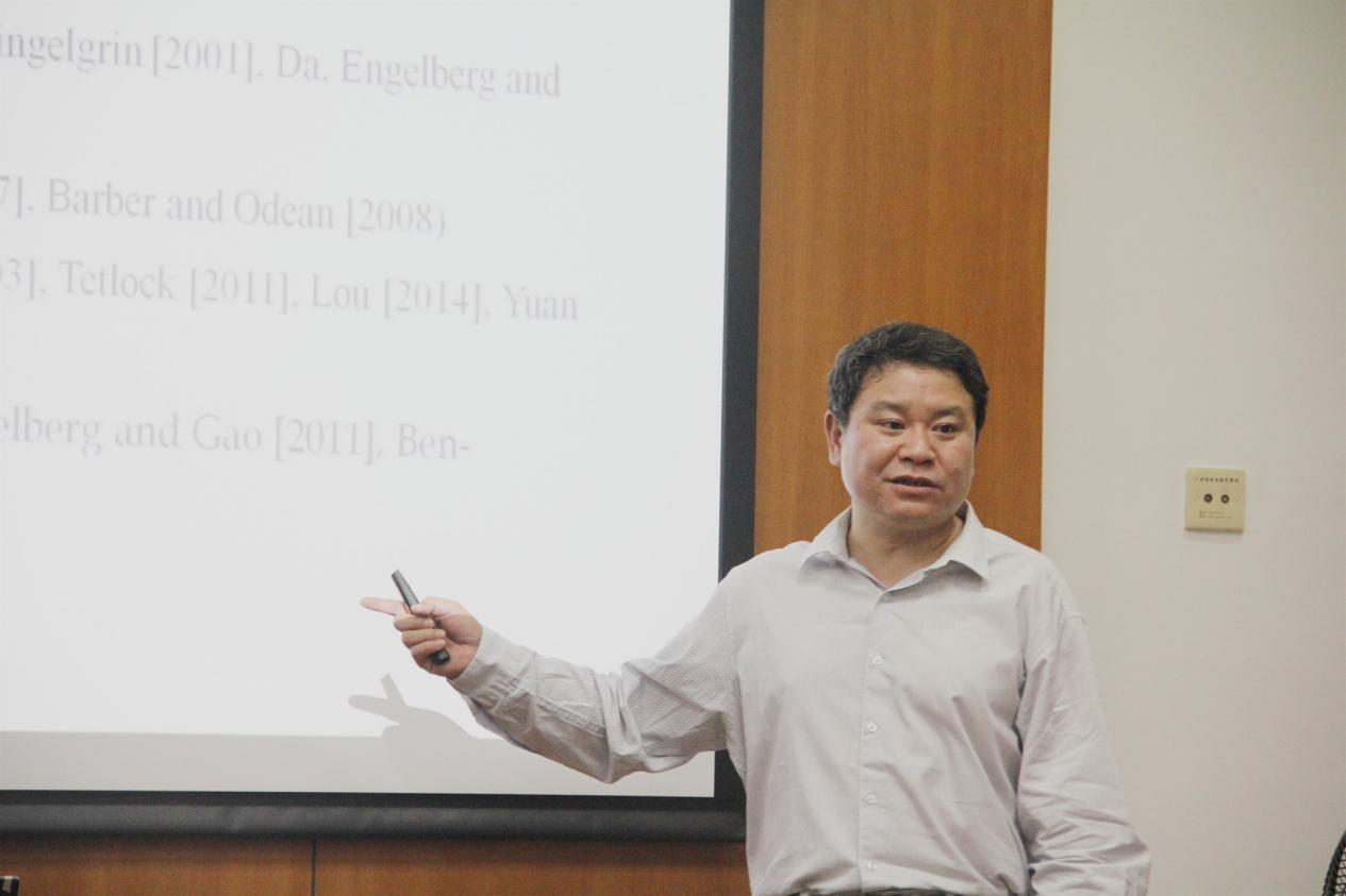 2018年11月15日(周四)晚七点,天津大学管理与经济学部副主任熊熊教授和厦门大学王亚南经济研究院、教育部计量经济学重点实验室副主任陈海强教授受邀做客广外金融论坛第二十六讲,在公司南校区院系办公室401室(太阳城会议室)分别做了主题为“新关注度指标与投资者订单不平衡”、“股东网络是否加剧崩盘风险?-基于A股市场的经验研究”的学术讲座,本次讲座由太阳城、广州华南财富管理中心研究基地、中国家庭金融与资产管理研究中心、国家社科基金重大项目“新常态下建立多点支撑的消费增长格局研究”课题组联合主办,由我院经理易行健教授主持会议。