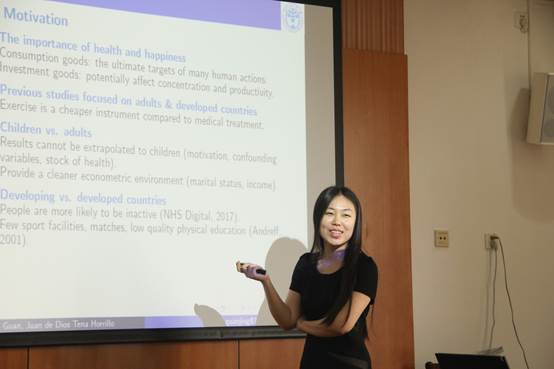 关晶分享了主题为“Estimating the Effect of Physical Exercise on Juveniles’ Health Status and Subjective Well-Being in China”的研究。她的研究评估了体育锻炼对中国初中生健康与幸福感的因果关系,使用来自中国教育小组调查(CEPS)的纵向数据库,该数据库通过考虑工具变量的使用和倾向评分匹配来处理体育锻炼的潜在内生性。研究结果表明,体育锻炼对健康有显著的积极影响,也略微提高了员工的幸福感。