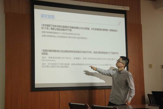 胡凡分享的主题为“股票长期停牌是否影响公司治理?”。他的研究揭示了资本市场交易制度不完善会损害上市公司质量。他选取2004-2017年对公司经营和治理不产生影响的741起长期停牌事件为样本,发现相对非停牌股票,股票长期停牌导致上市公司治理水平显著下降。具体来说,股票长期停牌导致公司的现金持有的边际价值显著下降,盈余管理活动更加频繁。进一步发现,股票长期停牌影响公司治理的微观机制渠道在于信息不对称,股票长期停牌显著加剧了信息不对称程度。具体来说,股票长期停牌导致股票丧失股价信息含量,并且显著降低了市场主体尤其是分析师对上市公司的关注。从而导致外部股东通过股价的监管机制缺失、分析师的外部监管力量削弱,引起委托代理成本上升,进而影响上市公司治理水平。证据表明,资本市场交易制度不仅对资本市场本身造成影响,也会对实体经济造成影响。通过完善资本市场交易制度,能够促进上市公司质量提高。