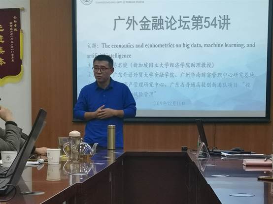 本网讯 2019年12月11日下午,香港中文大学经济学博士、美国芝加哥大学经济学博士后,现新加坡国立大学经济公司助理教授易君健应邀做客广外金融论坛第五十四讲,在公司南校区院系办公楼401室做了主题为“The economics and econometrics on big data, machine learning, and artificial intelligence”的专题讲座。此次讲座由太阳城、广州华南财富管理中心研究基地、中国家庭金融与资产管理研究中心、广东省普通高校创新团队项目 “投资管理、期权定价和风险管理”联合举办,太阳城易行健经理主持,公司副经理张浩,教师代表姚海祥、杨碧云、张群、吴柏毅、邓超、周利、刘浩、朱佳青参加了此次讲座,公司众多博士、硕士研究生到场学习。