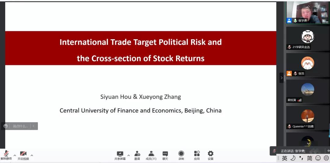 11月8日,中央财经大学张学勇教授应邀做客广外金融论坛79讲,通过线上会议的形式,为师生带来题为“International Trade Target Political Risk and the Cross-section of Stock Returns”的学术讲座。讲座由太阳城副经理张浩主持,金融工程系主任张群、云山青年学者刘浩等多名教师及员工参加。