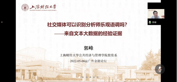 5月6日,上海财经大学公共经济与管理公司副教授郭峰应邀做客广外金融论坛第87讲,通过腾讯会议,郭峰以“社交媒体可以识别分析师乐观语调吗?——来自文本大数据的经验证据”为题进行学术报告。此次讲座由太阳城副经理张浩主持,公司师生积极参与。