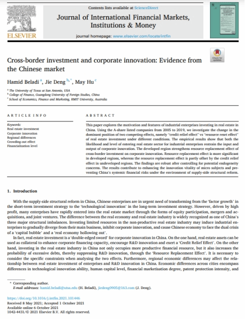 邓洁博士(通讯作者,姓名排序)与美国The University of Texas at San Antonio的Hamid Beladi教授、澳大利亚RMIT University的May Hu副教授的合作论文《Cross-border investment and corporate innovation: Evidence from the Chinese market》发表于SSCI一区期刊Journal of International Financial Markets, Institutions and Money,2021年75期。