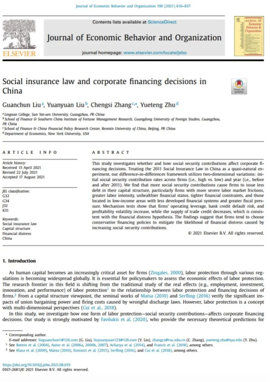 刘媛媛博士(共同一作,姓名排序)与中山大学刘贯春副教授、中国人民大学张成思教授和纽约大学朱越腾博士的合作论文《Social insurance law and corporate financing decisions in China》发表于国际著名经济学期刊Journal of Economic Behavior and Organization,2021年190期,第816-837页。
