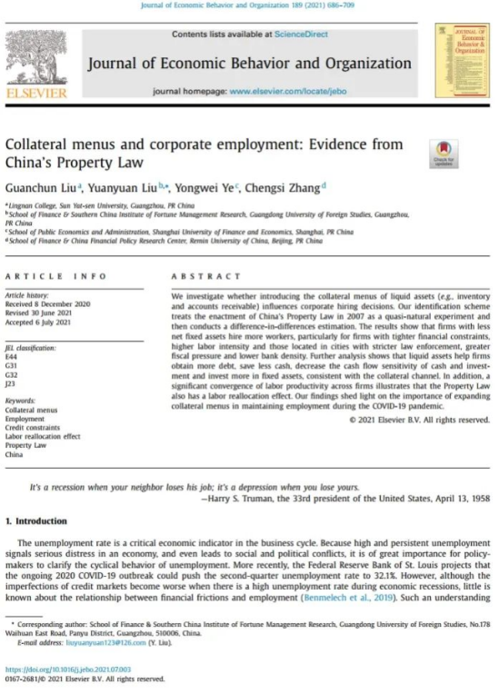 刘媛媛(通讯作者)的另一篇论文与中山大学刘贯春副教授、上海财经大学叶永卫博士生和中国人民大学张成思教授合作,论文题为《Collateral menus and corporate employment: Evidence from China’s Property Law》,发表于Journal of Economic Behavior and Organization,2021年189期,第686-709页。
