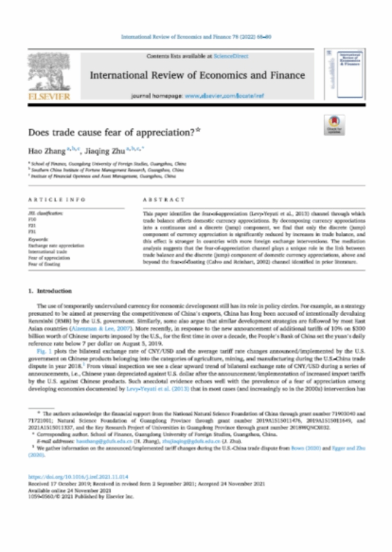 公司朱佳青博士(通讯作者)和张浩副教授(第一作者)合作论文《Does trade cause fear of appreciation?》发表于SSCI二区期刊International Review of Economics and Finance,2022年78期。