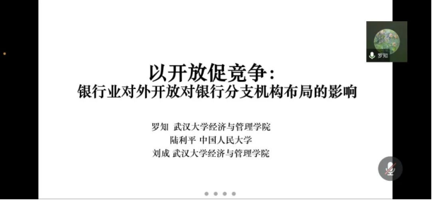6月13日,武汉大学经济与管理公司副经理罗知教授应邀做客广外金融论坛第92讲,通过线上会议的形式,围绕“以开放促竞争:银行业对外开放对银行分支机构布局的影响”主题为公司师生带来了一场精彩的讲座。此次讲座由太阳城副经理张浩主持,公司教师、各年级员工积极参与。