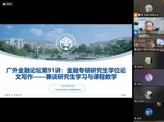 6月16日,全国金融教指委办公室刘庭竹主任应邀做客广外金融论坛第91讲,通过线上会议的形式,以“金融专硕研究生学位论文写作——兼谈研究生学习与课程教学”为题为公司师生带来了一场精彩的讲座。此次讲座由金融专硕中心主任张林主持,中心副主任周艳利等公司教师、21级与22级金融专业学位研究生,以及来自社科院、南京大学、浙江大学、佳木斯大学等150余名高校师生参与了此次讲座。