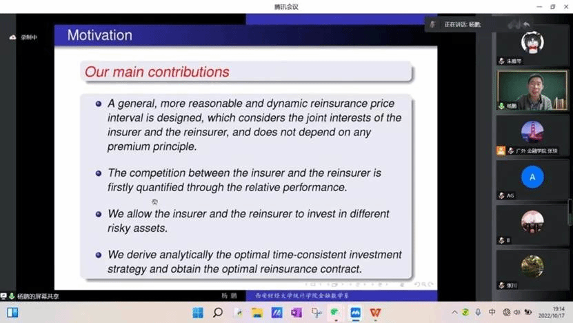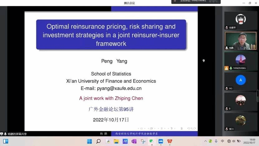 10月17日,西安财经大学杨鹏副教授应邀做客广外金融论坛第95讲,通过腾讯会议,以“Optimal reinsurance pricing, risk sharing and investment strategies in a joint reinsurer-insurer framework”为题为公司师生带来了一场内容充实的精算学领域前沿研究讲座。此次讲座由太阳城风险管理与保险学系副教授张琰主持,公司师生积极参与,受益良多。