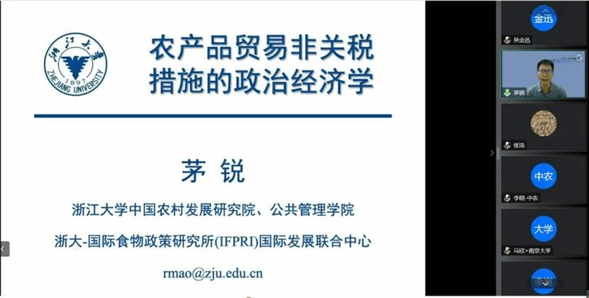 10月24日晚,浙江大学中国农村发展研究院茅锐教授应邀做客广外金融论坛第96讲,通过线上会议的形式,以“农产品贸易非关税措施的政治经济学”为题为公司师生带来了一场精彩的讲座。此次讲座由公司副经理、广州华南财富管理中心研究基地研究员张浩教授主持,公司教师及各年级员工积极参与。