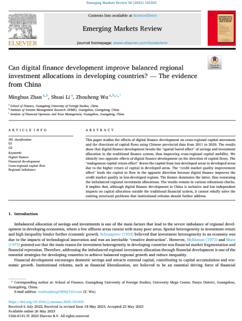 公司战明华教授(第一作者)、吴周恒副教授(通讯作者)和李帅博士(第二作者)合作论文《Can digital finance development improve balanced regional investment allocations in developing countries? — The evidence from China》发表于SSCI一区期刊Emerging Markets Review202356期。