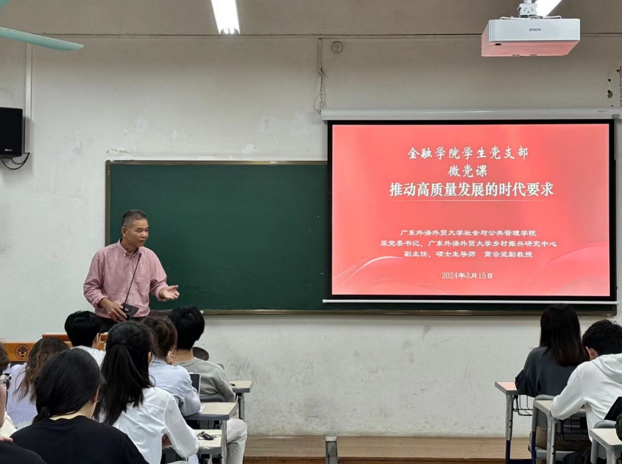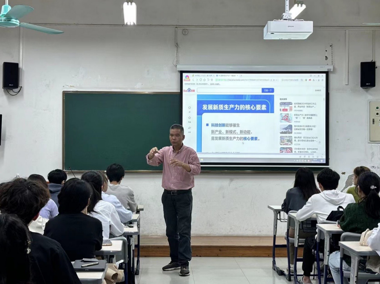 高云坚向各位员工展示发展新质生产力的具体要素与内容相关资料,同时,为了让同学们更好地理解党与新时代新形势的关系,高云坚副教授还特意准备了一段视频资料,视频展示了新时代党的新发展的具体事例,以及广东省对党的现代发展作出的行动与响应。视频结束后,教授进行了进一步的解释,同学们聚精会神地听着高云坚副教授生动而又深入浅出的分析。通过这些,同学们对新质生产力的概念有了更为清晰的认识。