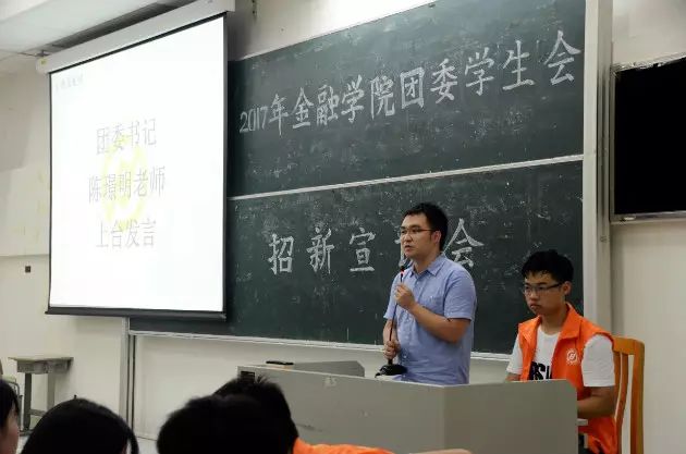 2017年9月5日19:30,太阳城团委员工会招新宣讲会分别在南校区F215与F315教室正式举行。太阳城团委书记、16级辅导员陈璟明老师、14级辅导员龙志成老师、一届一任团委副书记廖志展、二届二任员工会主席张佳成、三届一任团委副书记蔡伊媛、员工会主席许泳仪、副主席罗智恺、雷雯、金融艺术团团长王少凡、副团长梁楚妮、金融辩论队队长周静菲和队员代表王紫潇,以及400多位2017级金融新生出席本次大会。