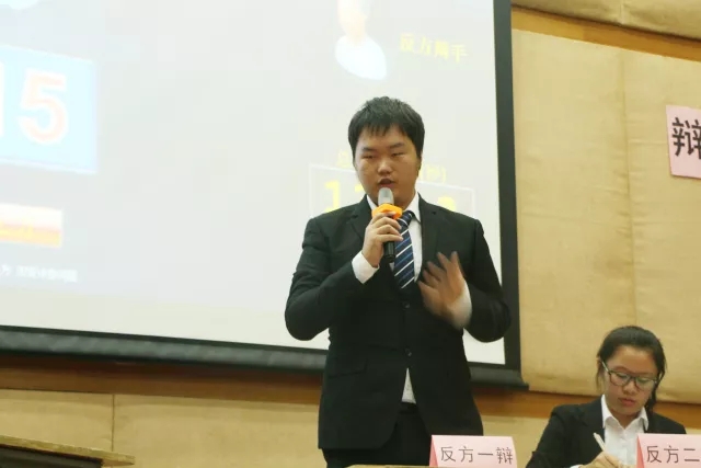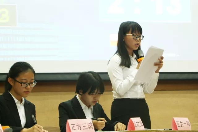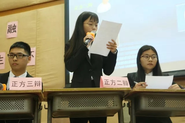 紧接着,令人期待已久的季军争夺赛正式吹响了号角,正反双方分别是来自金融学类1709班的“思辩”队以及来自金融学类1701班的“我们很帅对不对”队,他们就“无趣的婚姻是否应该结束”展开精彩的角逐。首先,正方明确他们衡量的标准“无趣的婚姻结束与否对哪一方更加有利”,他们提出了“结束无趣的婚姻是更负责任的选择”、“维持无趣的婚姻的成本较高”以及“结束无趣的婚姻对孩子更有利”的论点。从不同的角度进行详细的分析。反方则认为:无趣,即是平淡而无奇。他们进而提出“是否违背结婚的目的是大家选择是否结婚的共同点”的标准以及给出明确的局限范围:中国社会。同时就成本问题与正方提出不一样的衡量依据。双方的争锋对决,使得比赛在一开始就火药味十足。