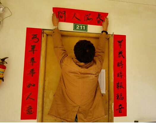 春联写好后,志愿者们就开始着手贴春联了。由于没有可以蘸浆糊的工具,志愿者们不怕脏不怕累,以手为工具,在春联的背面抹上浆糊。在一旁看着的老人们看到后,即刻热情地递来工具帮忙,还叮嘱志愿者注意安全。高个子的男生与女生就负责在每个房间门口贴春联。