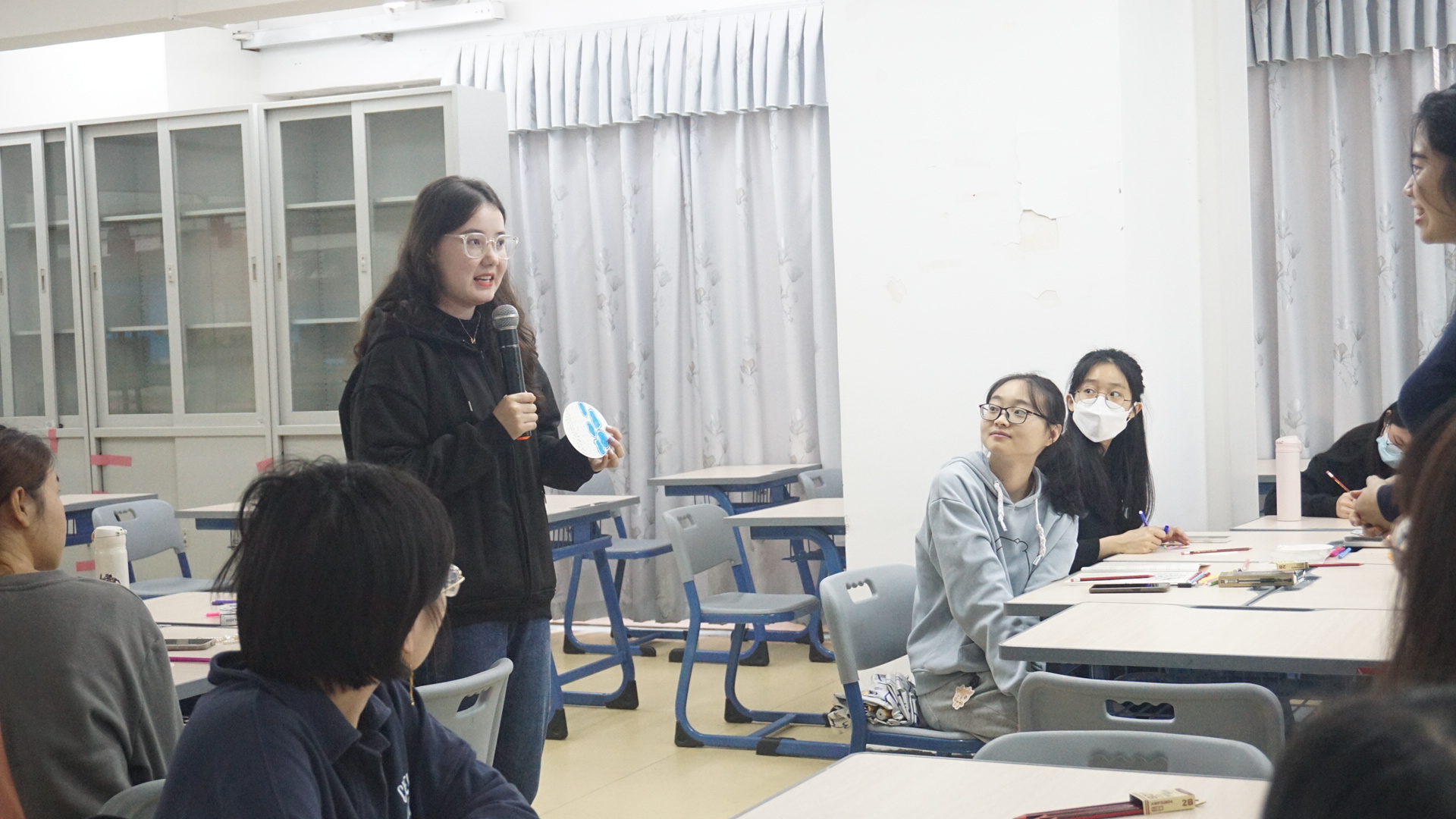 在分享环节,梁倩蓉引导同学们分享创作心理,相互欣赏赞美,以此提高自尊自信和自我效能感。