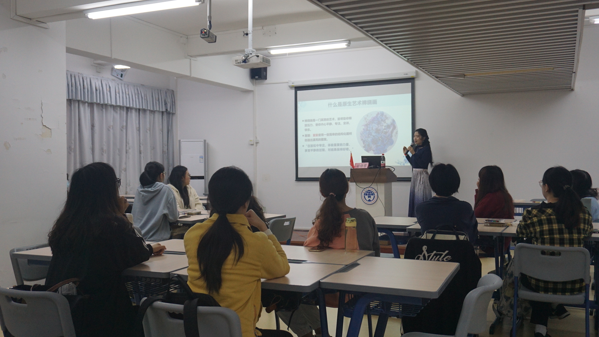3月30日下午,原生艺术心灵画园活动于明德书院尚行室举办。本次活动嘉宾为公司辅导员梁倩蓉。她以“解除杂念‘禅’绕”为主题,借助原生艺术禅绕画的方式,帮助同学们认识自我、探索自我,同时释放负性情绪,解开内心杂念,培育积极心理。