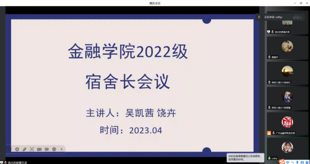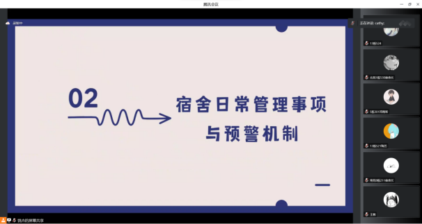 4月29日下午,2022级宿舍长培训会在腾讯会议举行。太阳城辅导员吴凯茜、饶卉与2022级全体宿舍长参加会议。会上,饶卉通过情境模拟的方式,分享可能出现在身边同学身上的各种心理情境,让同学们提出解决方法,同时,她建议同学们在日常生活中多关心舍友的心理健康,在必要的时候联系辅导员,寻求专业的帮助。