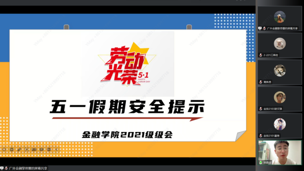 为进一步加强假期安全防范,牢固树立安全意识,确保同学们安全度过假期,2021级“暖心五一,安全常伴”级会于4月27日晚上在线上举行。会议由辅导员林路行、黎思蕾主持,2021级全体本科生参加会议。会上,两位辅导员开展了安全教育,鼓励同学们利用假期为身体蓄能、头脑充电、心理赋能,保持良好的习惯以及健康积极的心态,度过一个健康愉快的假期。