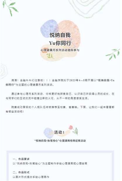 4月初,太阳城启动主题为“悦纳自我•Yu你同行”主题的心理健康月系列活动。旨在帮助同学们探索自我、认识自我,用心理漫画、公益广告、主题演讲、心理戏剧等表现形式诠释心理健康理念,普及心理健康知识。