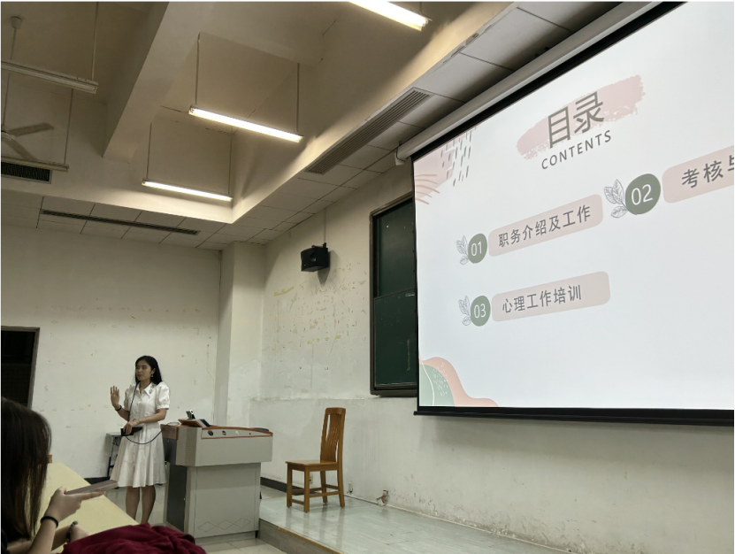 接下来,她详细解读了公司和公司心理委员管理规定,要求各班心理委员认真履行工作职责,从认知、情感、意志行为等方面关注同学们的心理状况,积极向心理援助队投递心理常识科普小推文,定期参加培训活动,同时特别提醒了各心理委员应遵循保密原则。