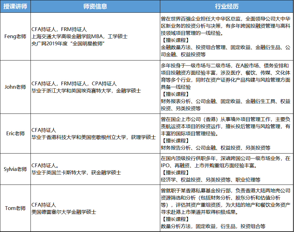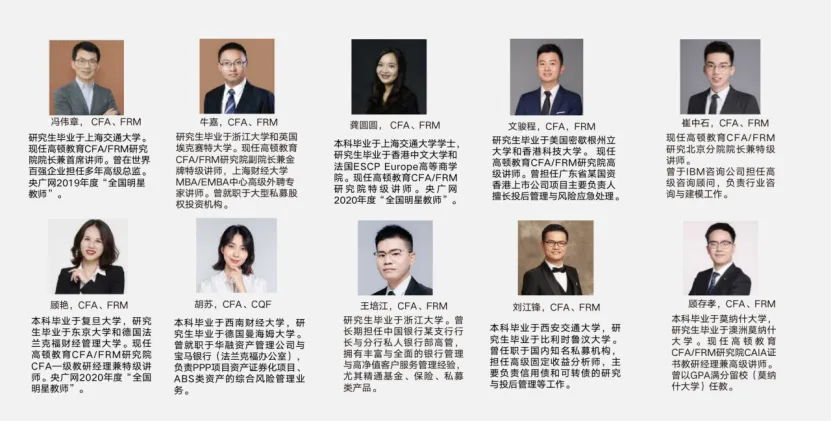 CFA+FRM周末菁英班全体团队由高顿教育集团提供,由金融行业顶尖人才和中外名校毕业生组成,从事CFA教学教研多年,经验丰厚。