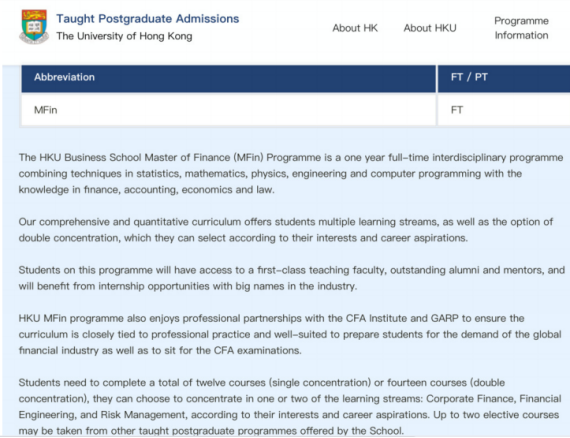 在毕业学子中备受喜爱的香港留学,以香港大学商公司金融硕士(MFin)课程为例,必须完成总共12门课程(包括4门以CFA课程为基础的财务分析基础课程),还与国际CFA金融协会和GARP(Global Association of Risk Professionals-FRM证书官方协会)建立了专业合作伙伴关系。