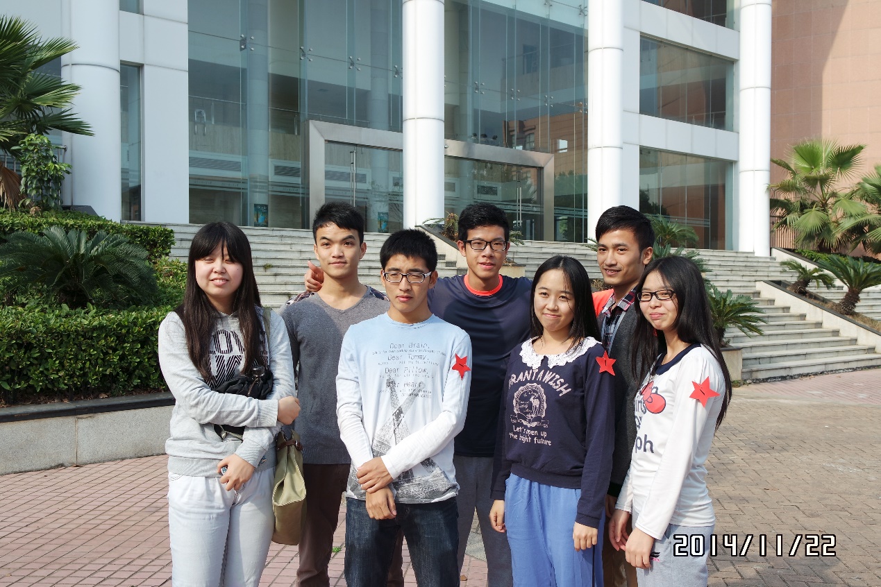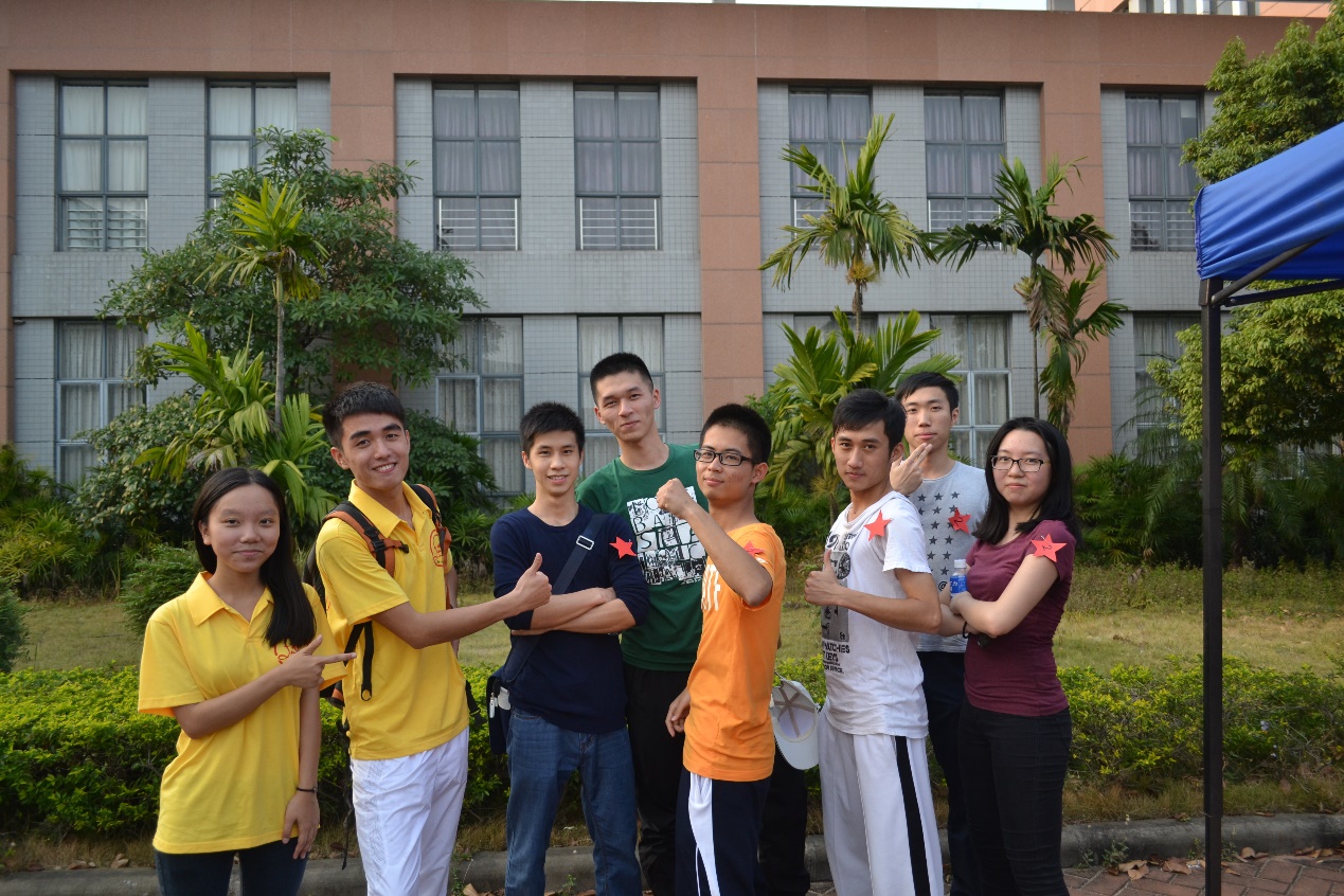 12级金融第二员工党支部抵达终点后合照留念,参赛代表露出淡淡的笑容,尽显他们的默契。队员们左肩的红星十分耀眼,象征他们充满正能量。