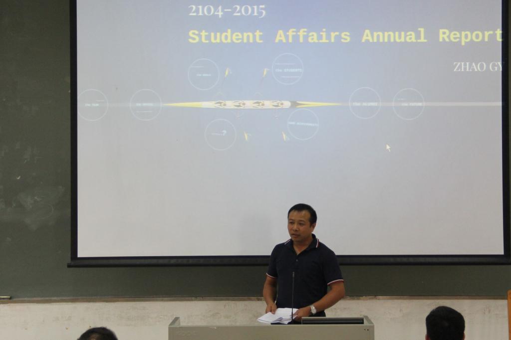 赵观音副书记主要从突发事件及应急案例,员工基本情况、获奖情况和就业情况,学工队伍建设,以及员工会工作等方面介绍本学期公司的员工工作。他指出,在突发事件的应对中,公司能按照公司的要求,妥善处理并做好员工的安全教育和心理辅导。在完全学分制改革中,员工工作也将积极应对挑战,继续做好员工的“五导”:思想上教导、心理上疏导、学习上辅导、就业上指导、生活上引导。
