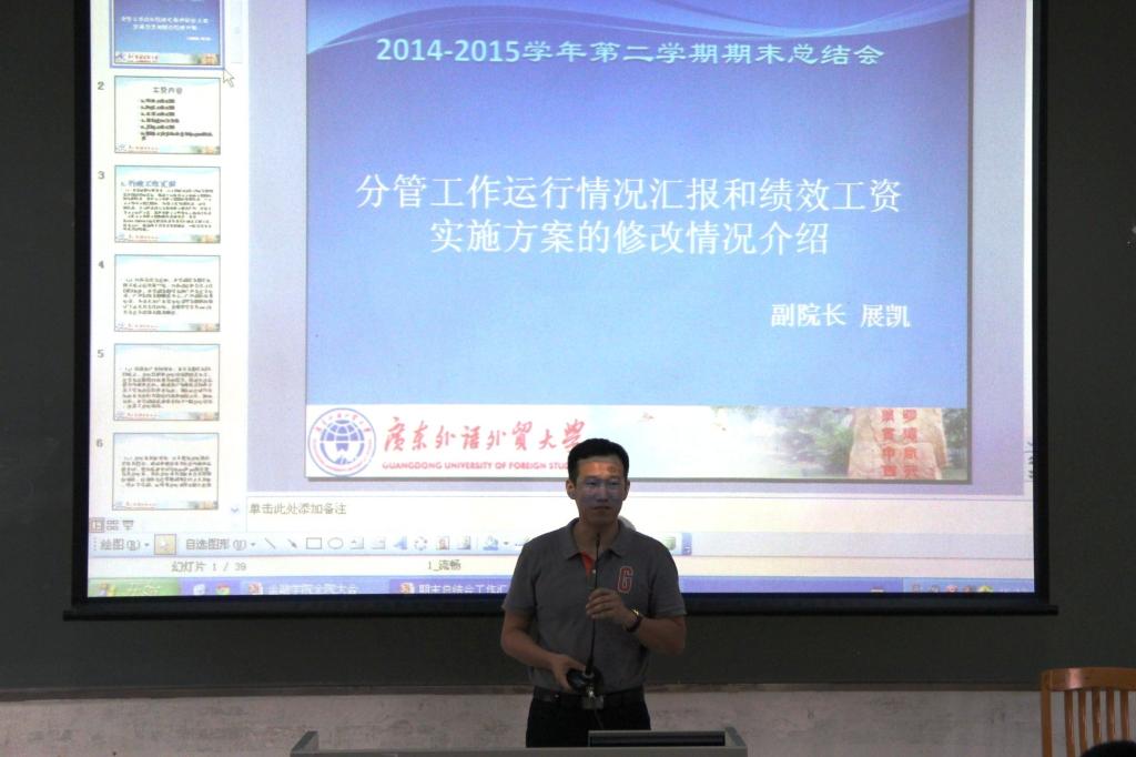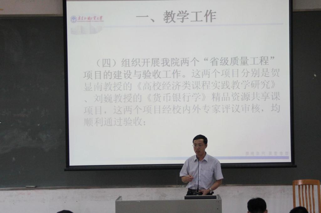 随后,廖国民副经理介绍了本学期公司的教学工作、学科、科研和研究生等方面的工作。他重点指出公司获批设立金融工程系,获批增设“国际商务硕士”学位点“国际金融运营”、“国际风险管理”两个招生方向,获批设立金融学科的“珠江学者”岗位;组织讨论学分制改革方案并制定教学计划;组织申报金融学综合实验室,获得公司资助;组织两个“省级质量工程”项目的建设与验收工作;邀请10余位专家共同研讨“应用金融研究中心”的建设规划与未来发展方向;开展科研奖励条例的模拟测算;开展广外建校50年周年系列学术活动10余场等。