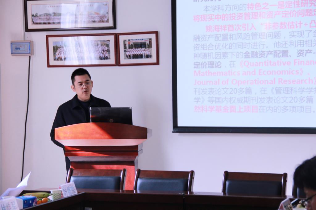 接下来,由本学科学术带头人姚海祥教授对金融工程团队建设情况和申报硕士点准备情况进行汇报。报告内容分为三部分,学科基础,设置理由,培养方案。简单回顾了学科发展历史沿革,学科研究方向以及取得的科研成果。本公司在金融工程领域有较强的团队队伍和研究基础,较为完善的公司产品方案。