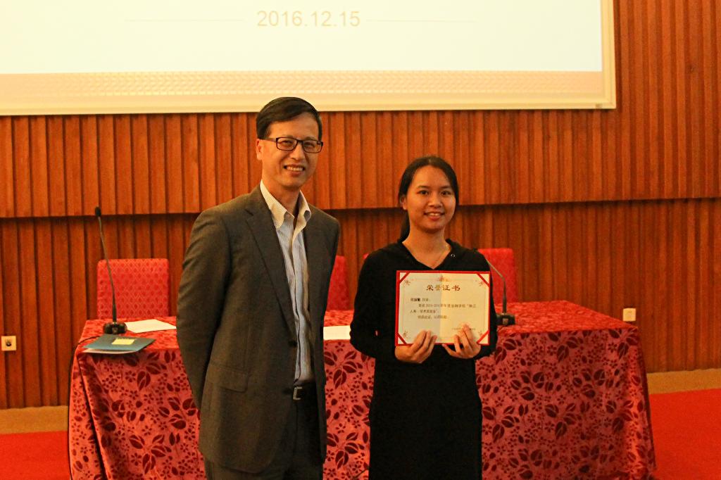 奖学金获得者黄晓冰作为代表发表了自己的获奖感言和学习心得,表示能够获奖非常开心,也将再接再厉,好好学习,合理安排自己的时间,注重理论与实际相结合,以后努力回报社会。