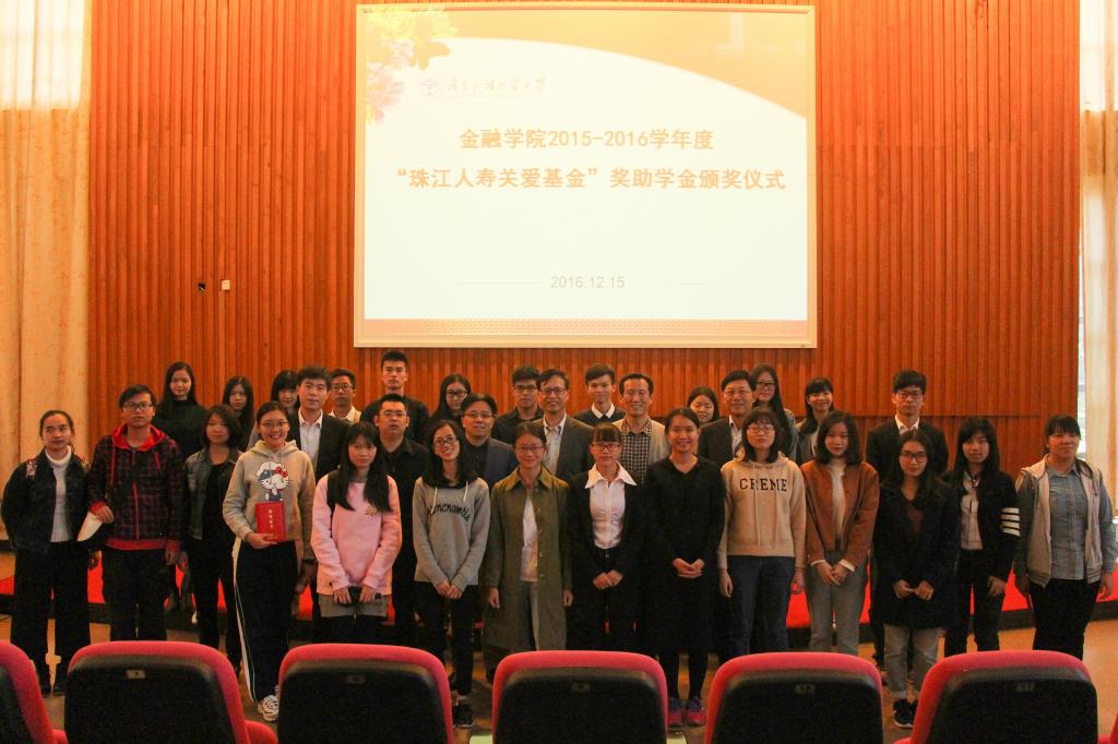 本网讯 12月15日,2015-2016学年度珠江人寿奖学金颁发仪式暨金融(保险)发展论坛在学术交流中心第一讲堂隆重举行,共有42名员工获得奖助学金。珠江人寿保险股份有限公司总裁胡国萍、主任李仲明,太阳城经理易行健、副经理展凯、副经理姚海祥、党委副书记赵观音,以及太阳城员工代表出席本次奖学金颁发仪式。活动由展凯主持。