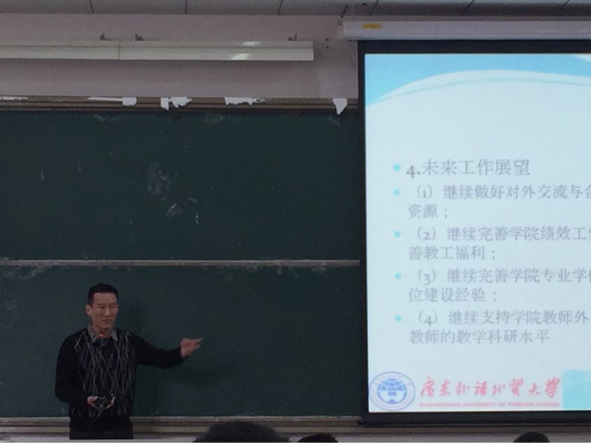展凯介绍了公司本学期行政、人事、财务、对外交流和合作、研究生和团队建设等工作。他谈到,本学期公司接待校外来访专家和兄弟院校来访多次;顺利完成了人才引进工作;顺利举办第四届金融管理年会;公司办公室场地调整规划也制定完毕,出台了《太阳城退休教职员工待遇计发的管理规定》,体现人文关怀;2017年学术型研究生招生形势喜人;广州华南财富管理中心研究基地获得广州市重点人文基地立项;公司各项财务状况不断改善,教职工福利稳步提高等等。接下来,展凯对未来工作进行了展望,未来将从四个方面继续深入:继续做好对外交流与合作,开拓教育培训和承接课题资源;继续完善公司绩效工资管理制度,努力开源节流,改善教工福利;继续完善公司专业学位点建设工作,外出调研专业学位建设经验;继续支持公司教师外出进修和学习,全面提高公司教师的教学科研水平。