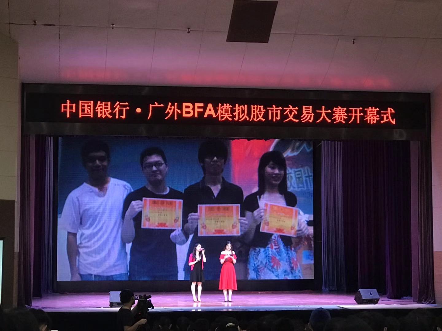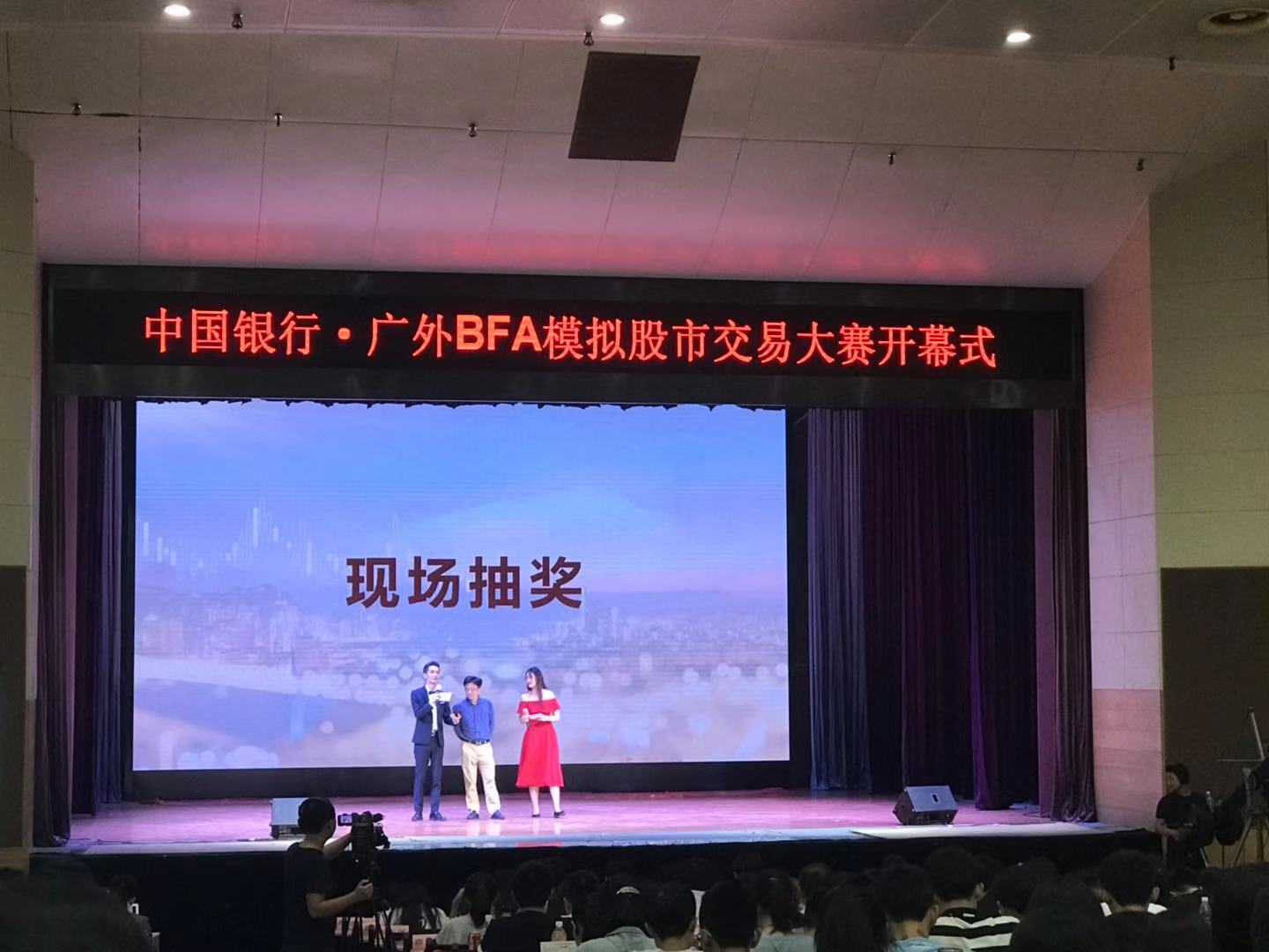 本网讯 10月28日晚,稳操胜券,为自己正名——太阳城娱乐城模拟股市大赛开幕式在公司南校区B8学术报告厅举行。比赛由公司校级优秀实习基地中国银行广东省分行、广外商业金融协会共同举办,公司经理及党委书记易行健、副经理张浩、党委副书记赵观音,中国银行广东省分行网络金融部副总经理刘双兵、省行个人金融部高级经理杨建铭、白云支行副行长訾先萍、中银国际证券广东分公司市场总监张伟志出席了本次开幕式。
