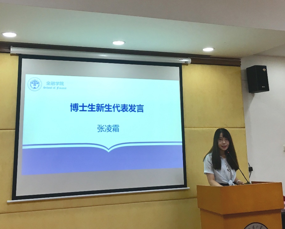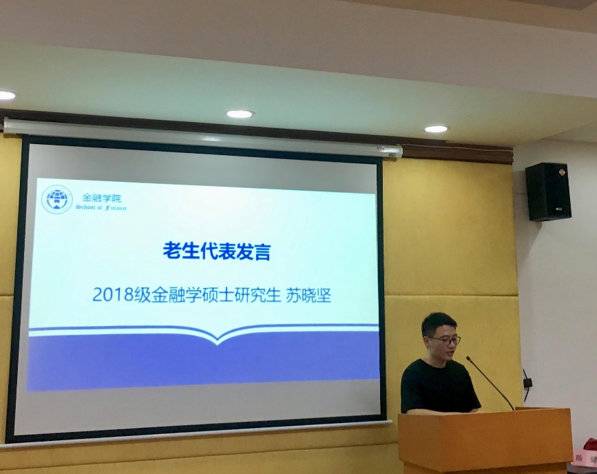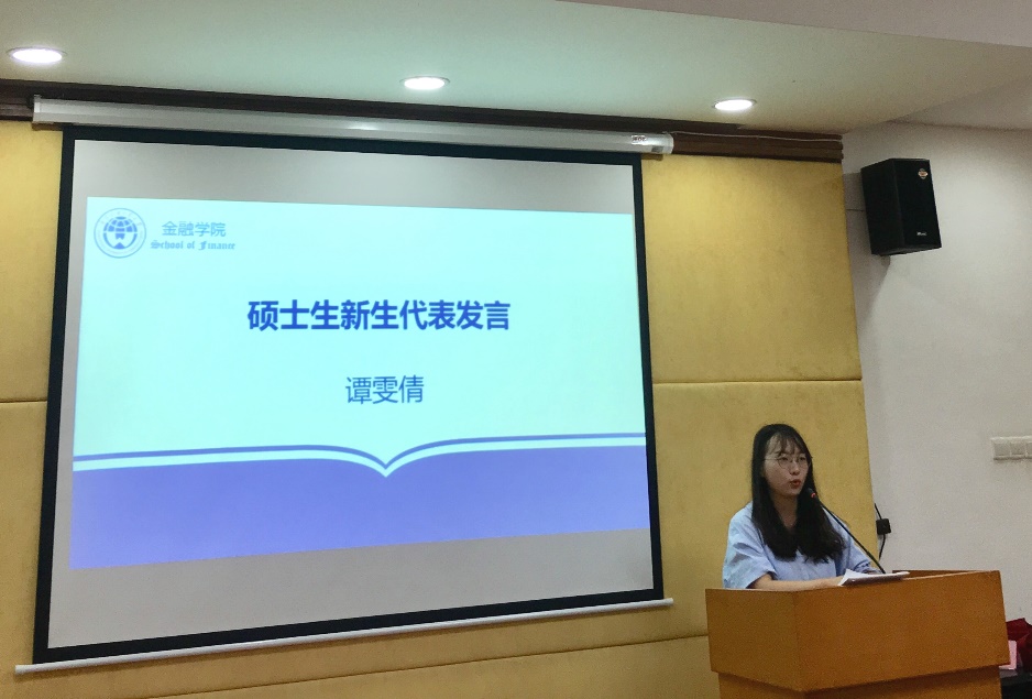 老生代表2018级金融学硕士研究生苏晓坚为新生们分享了一年来的学习和生活的心得和体会:要明确自己的研究生学习目标,做好学术研究,学习之余保持身心健康。随后,博士生新生代表张凌霜与同学们分享自己对于未来的研究生活的见解:应该开拓进取,在实践中成长,在思考中创新,专注学习,不虚度光阴。最后,硕士生新生代表谭雯倩分享了自己大学四年的学习生活,希望在未来的研究生生活中重新开始、踏实完成学业、培养自己的科研能力,与各位同学一起学习、一起努力。