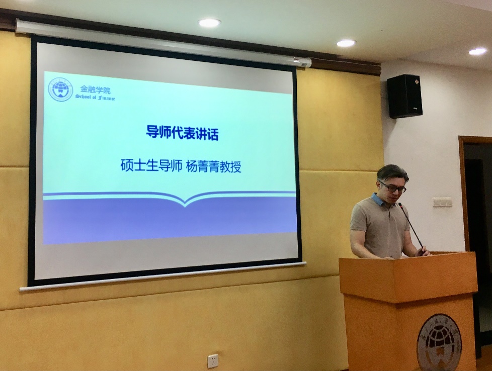 随后,导师代表杨菁菁教授上台发言,对太阳城、金融行业的发展进行介绍,并对研究生生活提出几点建议:打磨自身竞争力、拓展知识领域和职业技能;加强自身道德素养;提高独立的动手和思考能力;与导师保持良好的沟通。