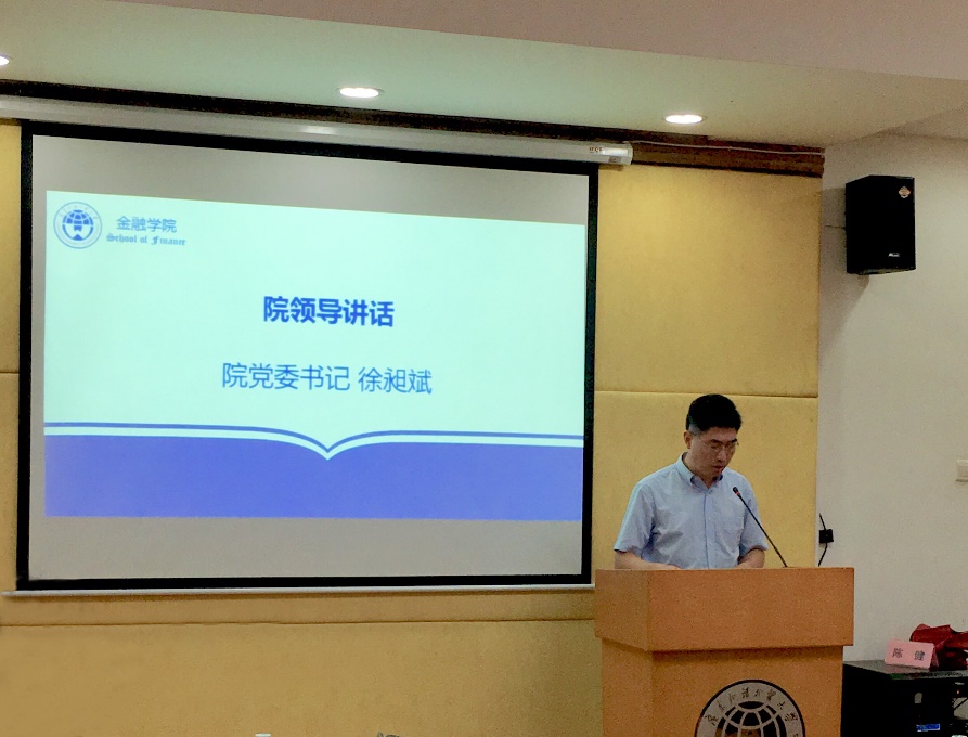 接着,公司党委书记徐昶斌老师上台讲话。徐书记主要从学术生涯、职业发展以及人生规划的角度提出了几点建议:第一,希望大家要有责任感和使命感,把个人的发展融入到国家命运当中去;第二,不管何时都要恪守学术道德,讲求学术诚信;第三,要忠于自己的学术承诺,做一名纯粹的研究生。最后,他祝愿同学们在广外的学习生活一切顺利、学有所成。
